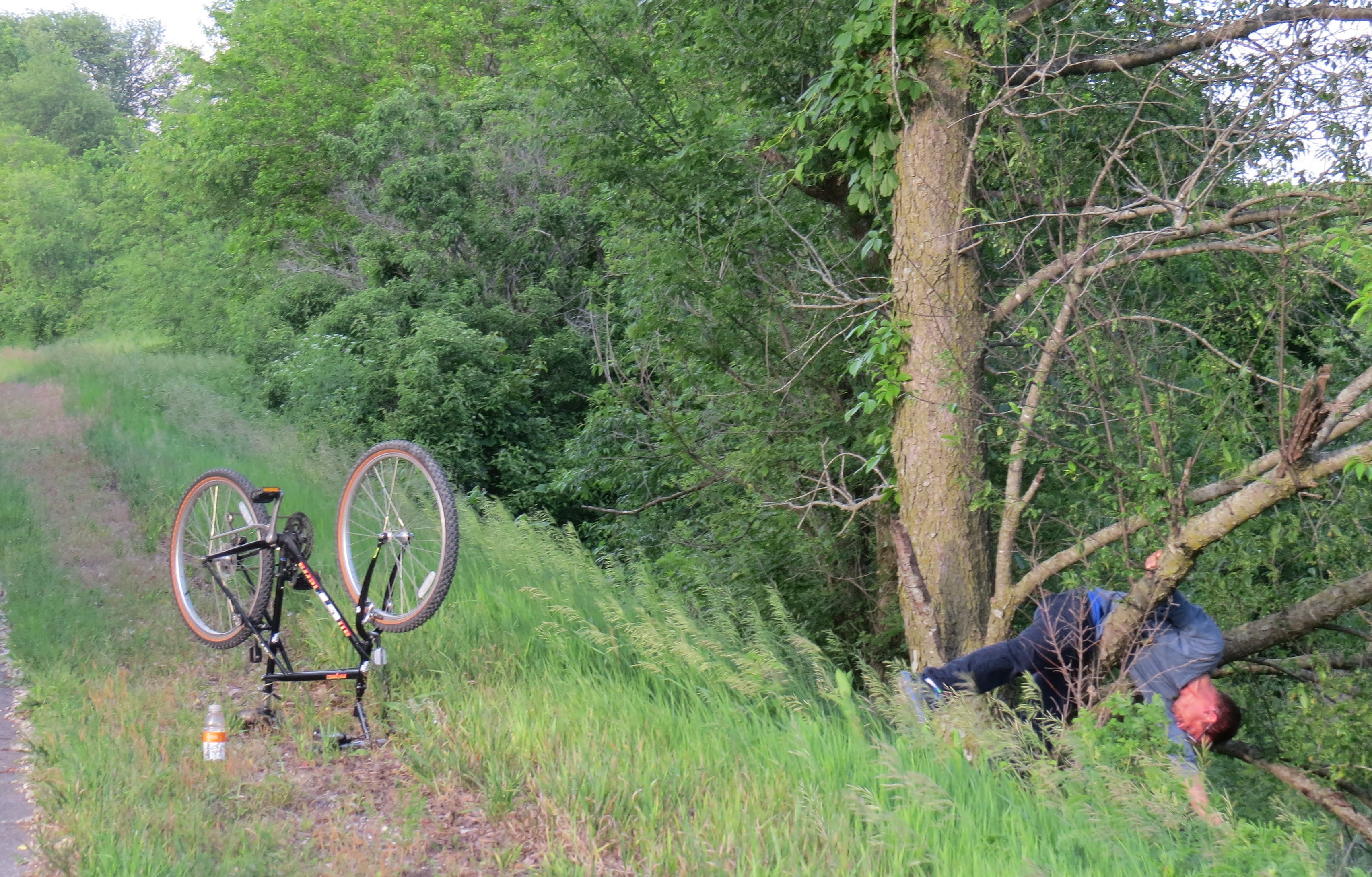 We hiked, explored the downtown river walk, ate at a variety of restaurants, and rode bikes. Here’s a great example of my son’s wacky sense of humor. My sister and I, following along at a slower pace, encountered this amusing vignette on the way back to our vehicles. It reminds me of my dad, Wesley’s grandpa, as this is exactly the kind of stunts he liked to pull. It occurs to me now that it might have been funny if Molly and I had just continued riding along as if we hadn’t even seen him.