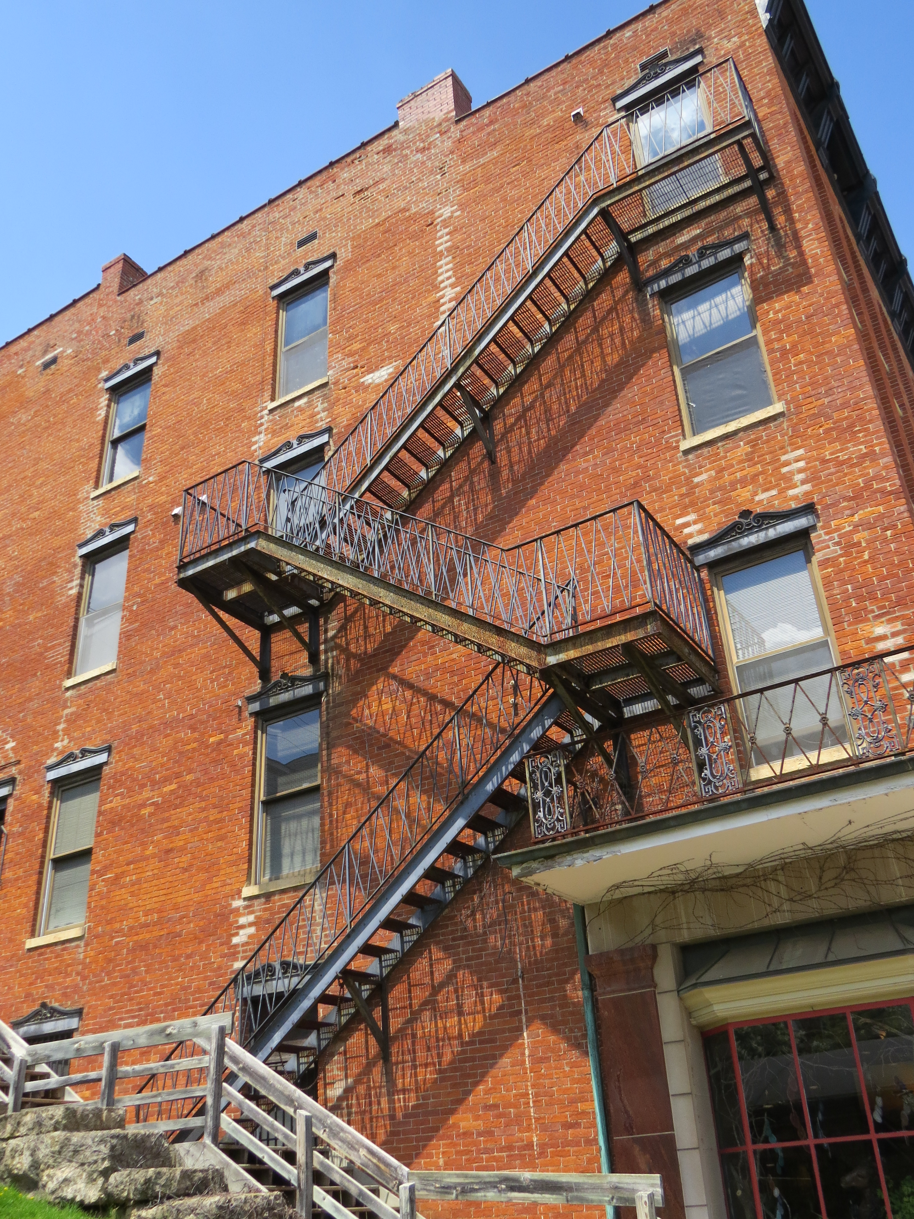I love the clean, angular lines of this fire escape staircase, the shadows thrown onto the brick walls, the metalwork – both the intersecting picket railing and the graceful filigree elements – and the architectural detail of the windows.